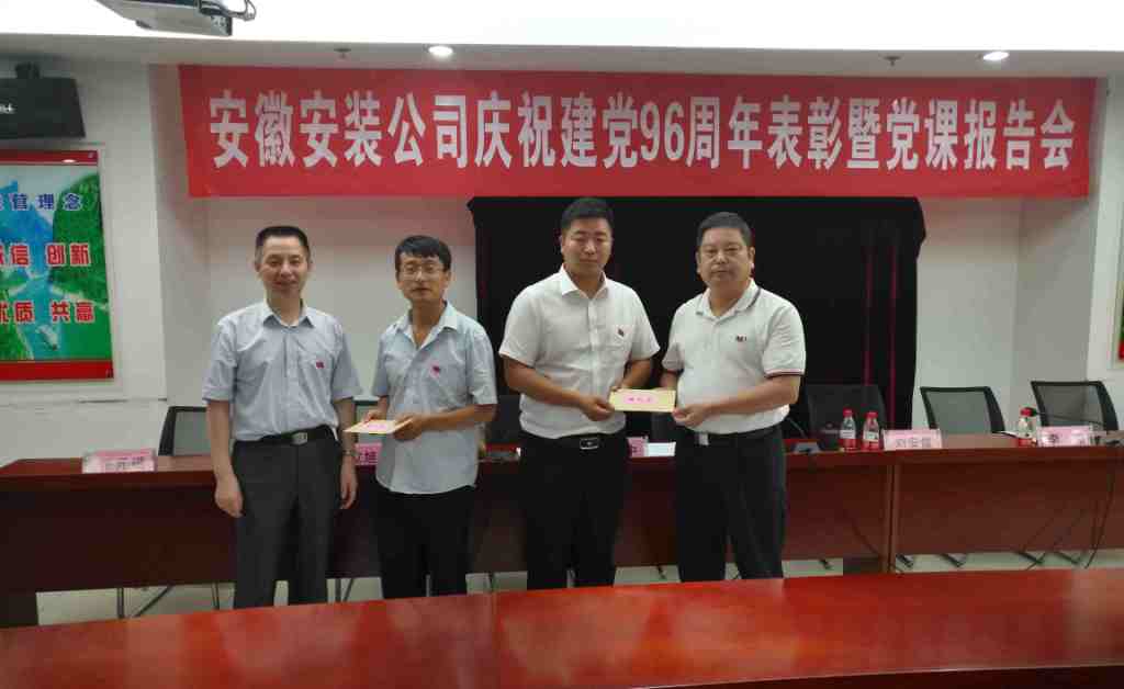 6月29日下午,安徽安裝公司召開慶祝建黨96周年表彰大會(huì)暨“七一”專題黨課活動(dòng),公司領(lǐng)導(dǎo)班子、在肥在崗黨員、入黨積極分子以及受表彰的先進(jìn)集體、先進(jìn)個(gè)人等60余人參加了會(huì)議。會(huì)議由公司董事長(zhǎng)、總經(jīng)理、黨委副書記王軍邦主持。