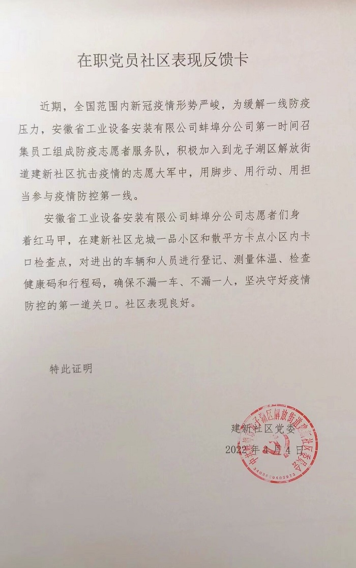 通過本次活動,志愿者們用實際行動踐行了初心和使命,展現(xiàn)了安徽安裝志愿者飽滿的精神風貌。建新社區(qū)黨委表達了對于安徽安裝公司的真誠感謝,期間社區(qū)及時通過微信公眾號對安徽安裝積極擔當社會責任予以報道,有效擴大了企業(yè)影響力,樹立了良好企業(yè)形象。
