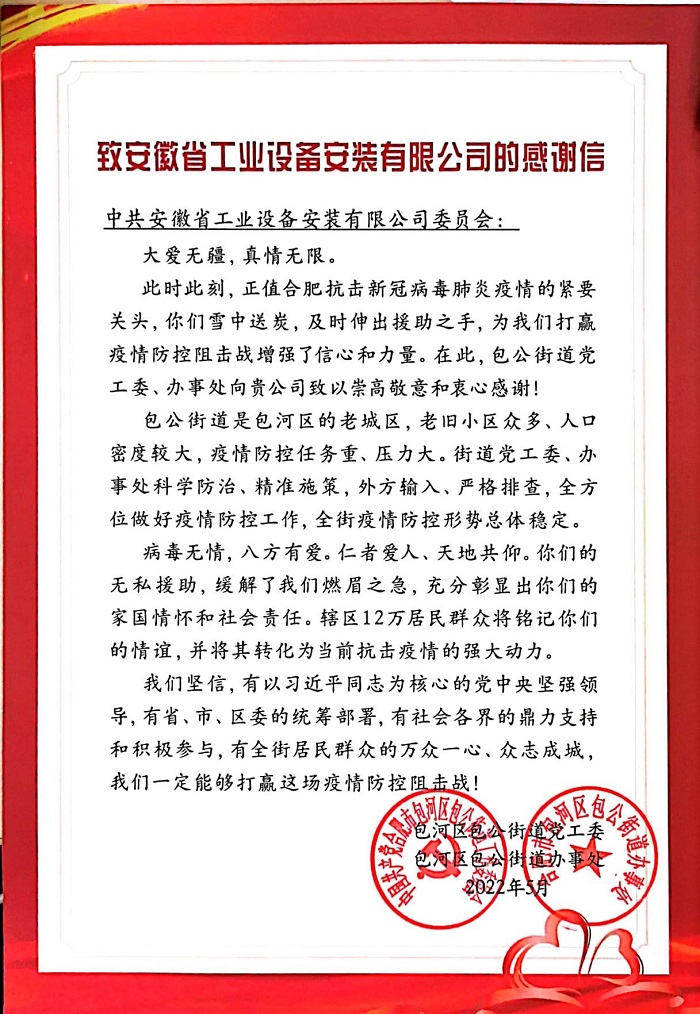 近日,包河區(qū)包公街道街道黨工委委員,辦事處副主任劉亮,包河區(qū)包公街道炳輝社區(qū)黨委書(shū)記房磊給安徽安裝公司送來(lái)了感謝信,信中表達(dá)了對(duì)安徽安裝公司在合肥抗擊新冠病毒肺炎疫情急要關(guān)頭迎難而上、勇于擔(dān)當(dāng),積極支援疫情防控的感激之情。