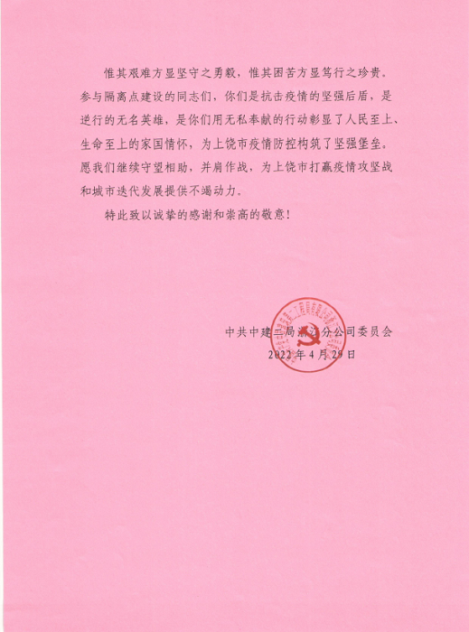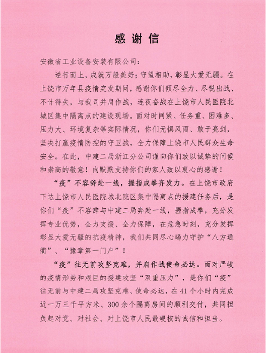 信中對安徽安裝公司與中建二局浙江分公司共同援建上饒市人民醫(yī)院北城區(qū)集中隔離點給予高度的肯定和認可。當前,新冠疫情形勢嚴峻,安徽安裝公司在嚴格落實屬地疫情防控措施的同時,一方面積極參與本地區(qū)隔離點、醫(yī)院發(fā)熱門診的緊急建設任務;另一方面攜手相關(guān)行業(yè)兄弟單位同心協(xié)力、援建市外防疫區(qū)域,承擔起國有企業(yè)社會責任,竭盡所能地為防疫建設貢獻最大的力量!
