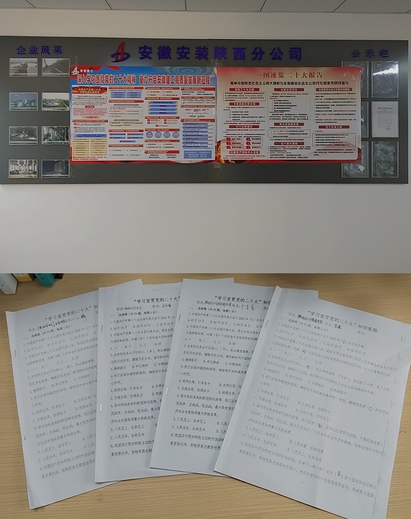 為抓好抓實黨的二十大精神的學習宣傳貫徹工作,近期,陜西分公司黨支部以“三會一課”、職工大會的形式組織開展黨員干部職工學習黨的二十大精神學習研討會;分公司開展“學習宣貫黨的二十大”知識答題活動,以考促學,以學促知,以知促用,充分檢驗學習效果;通過制作黨的二十大精神宣傳圖,開展立體式廣泛宣傳,推動大會精神深入職工群眾;通過開展一系列特色學習教育與宣傳活動,切實把黨的二十大精神帶到職工群眾身邊,為提高黨員干部職工對黨的二十大精神的全面掌握與學習起到促進作用,使黨的二十大精神成為分公司各項工作發(fā)展的思想與行動綱領。