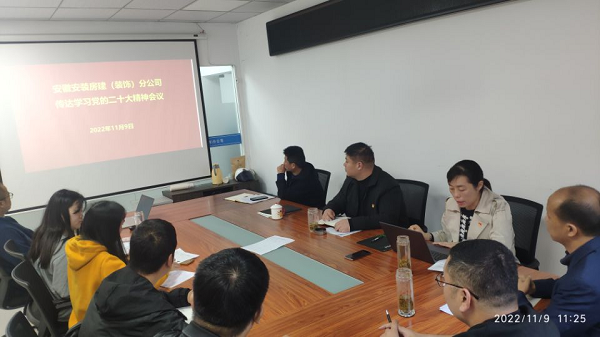11月9日上午,房建(裝飾)分公司黨支部組織全體黨員、在肥干部職工、項目經(jīng)理召開學習研討黨的二十大精神專題會議。會議要求,全體干部職工要統(tǒng)一思想,凝心聚力,把學習二十大精神與與分公司實際工作相結(jié)合,對照年初各項指標任務,努力強弱項,補短板,狠抓落實,推動分公司各項工作上臺階。