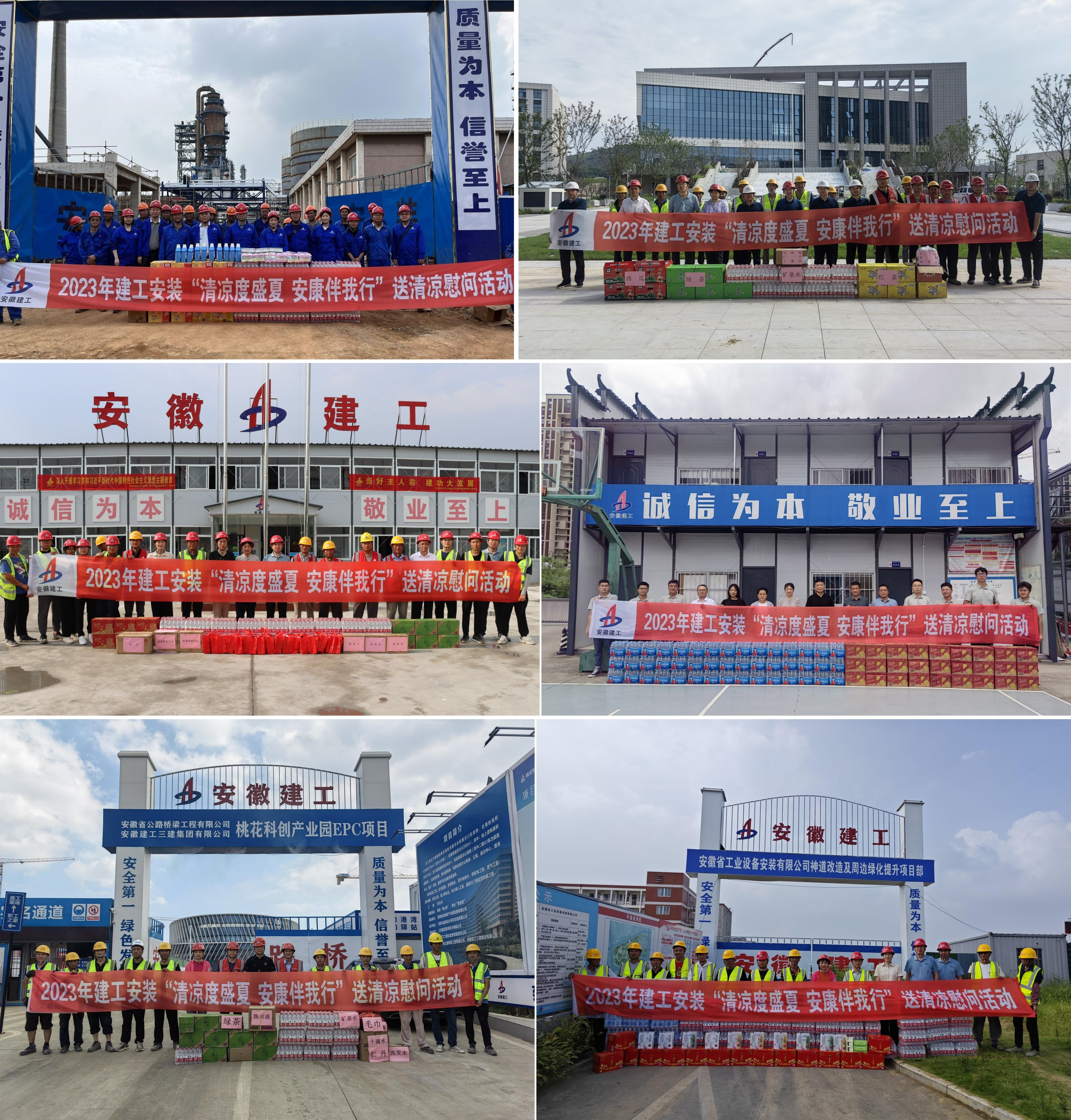 此次慰問(wèn)先后來(lái)到中石化安慶分公司循環(huán)水排污水治理項(xiàng)目、蚌埠市公安局“三個(gè)基地”項(xiàng)目、阜南縣城南污水處理廠改擴(kuò)建及配套管網(wǎng)工程(廠區(qū)工程)、合肥市高鐵路初中及高鐵路小學(xué)項(xiàng)目、桃花科創(chuàng)產(chǎn)業(yè)園EPC項(xiàng)目、神道改造含停車(chē)場(chǎng)及周邊綠化提升項(xiàng)目等施工一線,給大家送去西瓜、礦泉水、王老吉、仁丹等防暑降溫物品及夏日清涼洗護(hù)用品,為高溫下堅(jiān)守工作崗位的一線職工送去清涼和關(guān)懷。