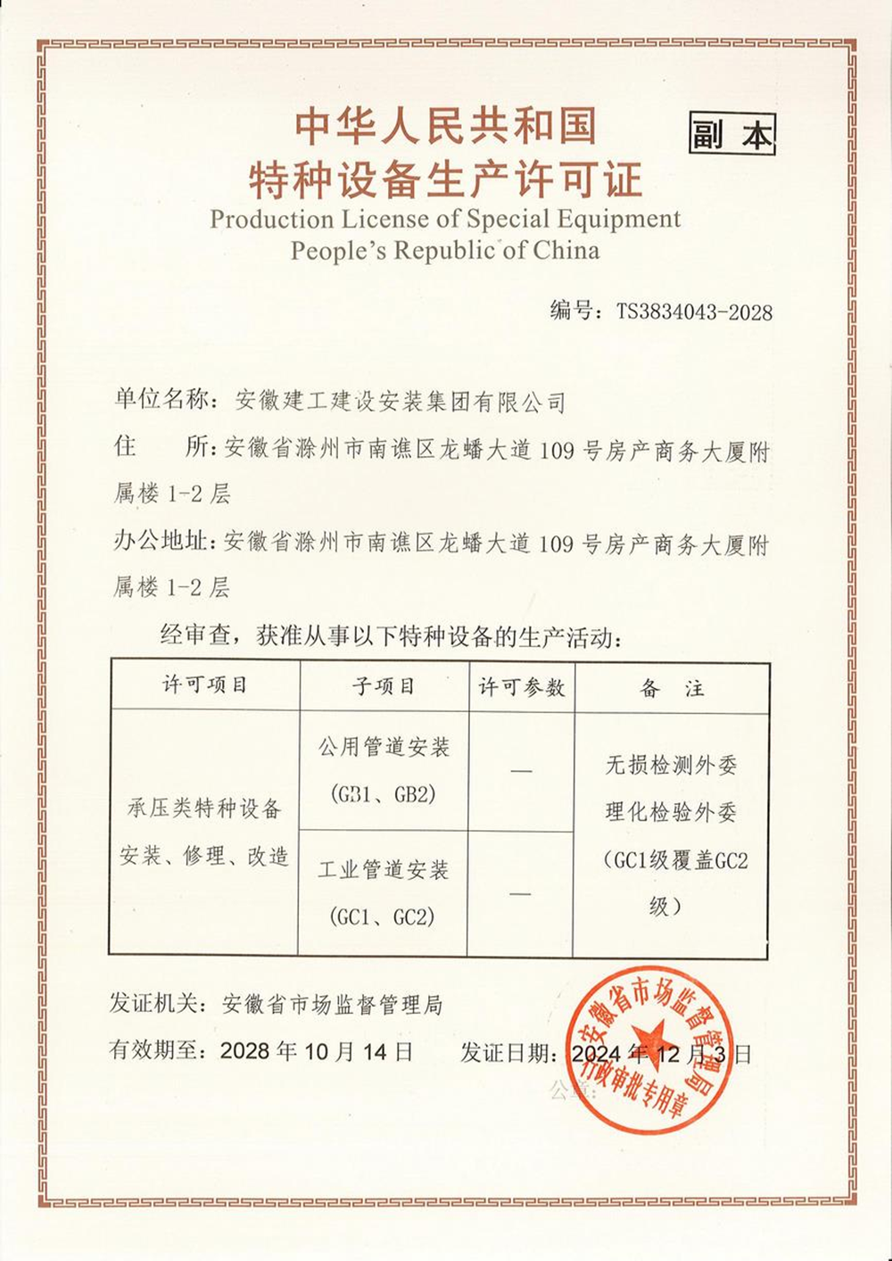近日,建工安裝“承壓類特種設(shè)備安裝、修理、改造—壓力管道(GB1、GB2)、(GC1、GC2)”延續(xù)換證工作順利通過中國工業(yè)氣體工業(yè)協(xié)會、安徽省特種設(shè)備檢測院等各方的評審核查,現(xiàn)已取得安徽省市場監(jiān)督管理局頒發(fā)的新證,為公司相關(guān)業(yè)務(wù)的開展奠定了良好基礎(chǔ)。